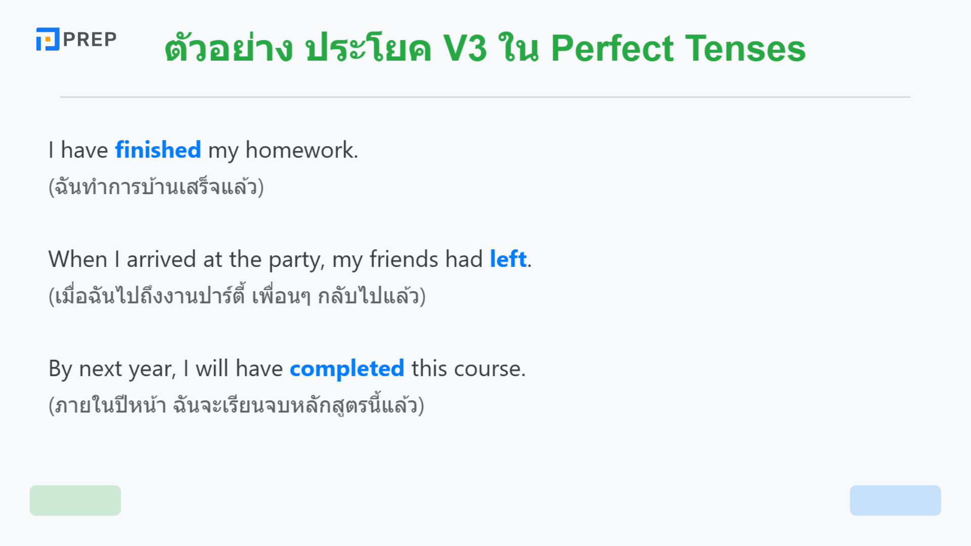 คุณอาจเคยพบ ประโยค v3 ในชีวิตประจำวัน เช่น "ฉันได้ทำการบ้านเสร็จแล้ว" (I have finished my homework) หรือ "หนังสือเล่มนี้เขียนโดยนักเขียนชื่อดัง" (This book was written by a famous author) ซึ่งทั้งสองประโยคใช้โครงสร้าง have has past participle และ be past participle ตามลำดับ