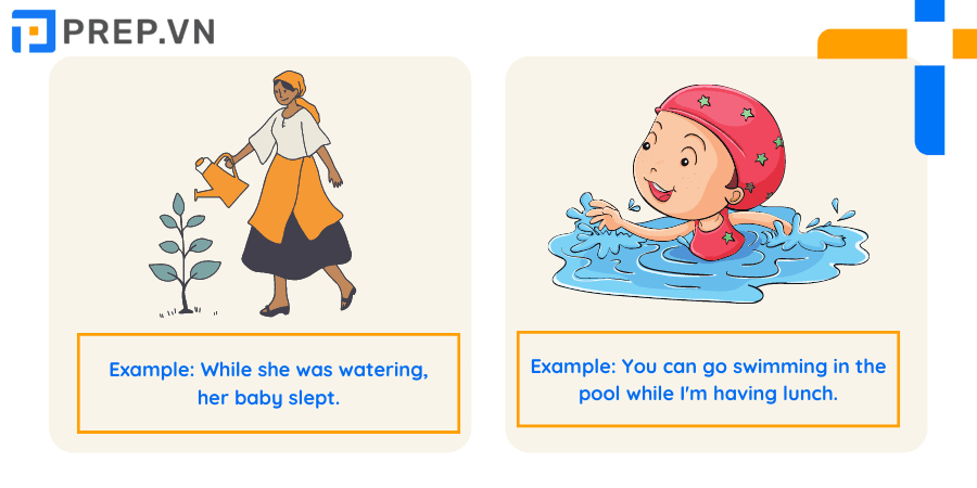 - While she was watering, her baby slept. (Trong khi cô ấy đang tưới nước, đứa con của cô ấy đã ngủ.)